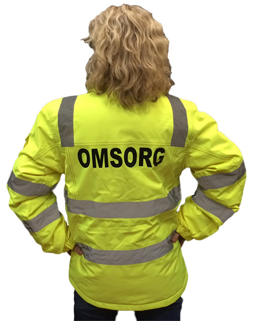 Gul jakke med "omsorg" i trykk på bryst og rygg, kr.1.200,- + porto. Jakken finnes i størrelsene S, M, L og XL.